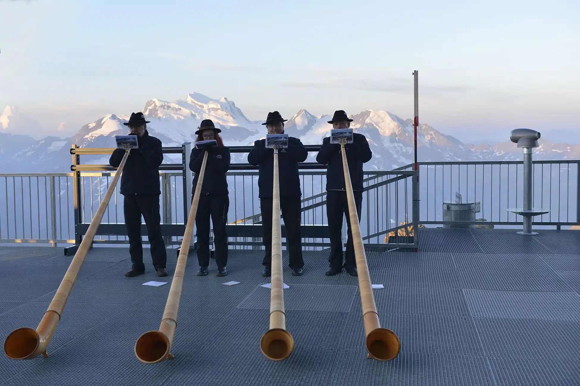 Sullo sfondo la visione della maestosità del Monte Bianco ascoltando il suono che da secoli percorre le valli svizzere.